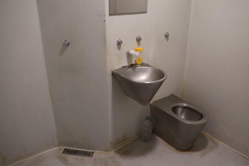 Dans ce centre, elles sont particulièrement dégradantes. Rue89Lyon a eu plusieurs fois l’occasion de documenter les conditions de vie au sein du Cra 2 et elles n’ont pas évolué : des lieux sales, des « espaces détentes » dégradés et se résumant à une table, des chambres qui ne se ferment pas, des toilettes sans portes (et donc sans intimité), un accès aux soins limités… « On sent que tout est fait pour les humilier », glisse la sénatrice Anne Souyris pendant sa visite.