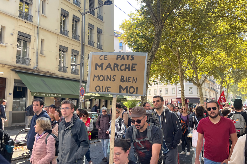 « Je suis là parce que je n’ai pas le choix », lâche Julie, le visage fermé. Sur son fauteuil roulant, la jeune femme de 34 ans, atteinte d’une maladie génétique, brandit une pancarte au slogan cinglant : « Ce pays marche moins bien que moi ». Venue spécialement de Haute-Loire pour l’occasion, elle a rejoint, à Lyon, les quelque 12 000 manifestant·es selon les syndicats (5000 selon la Préfecture) qui ont répondu à l’appel de l’intersyndicale, ce jeudi 2 octobre.
