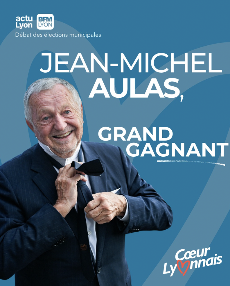 Dès la fin du débat, plusieurs proches du candidat Cœur lyonnais, notamment des comptes liés à « Génération Aulas », ont partagé un visuel semblant émaner de la communication du candidat, affichant un « JMA » tout sourire, cravate au vent, à côté du slogan « Aulas, grand gagnant ».
